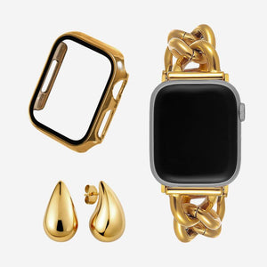 The Gold Essentials Bundle brings together three of our most-loved pieces in one effortless set: the Venus Bracelet, a Chrome Screen Protector, and the Juliette Huggie Earrings, all in timeless gold.